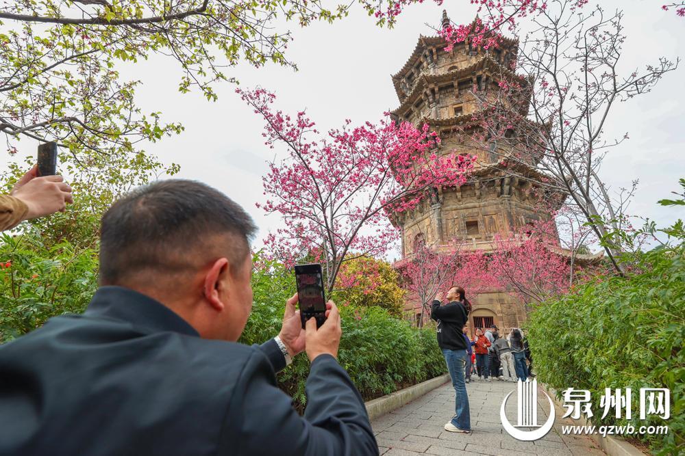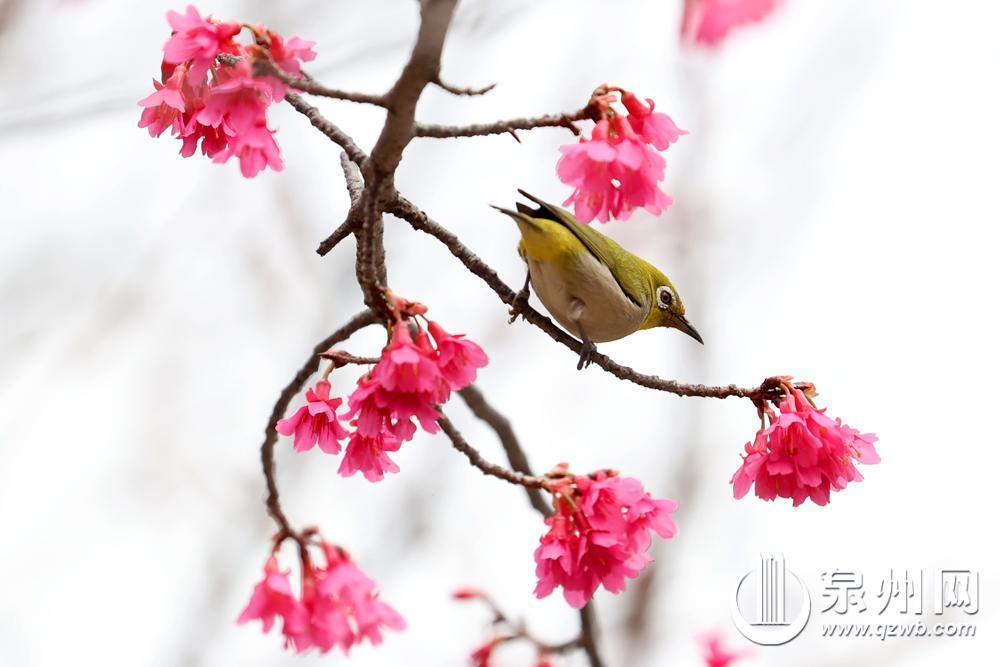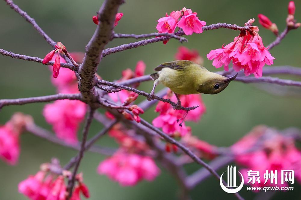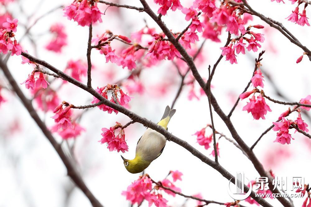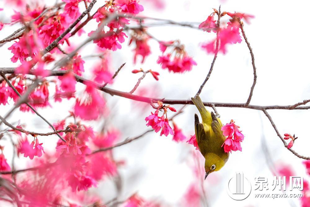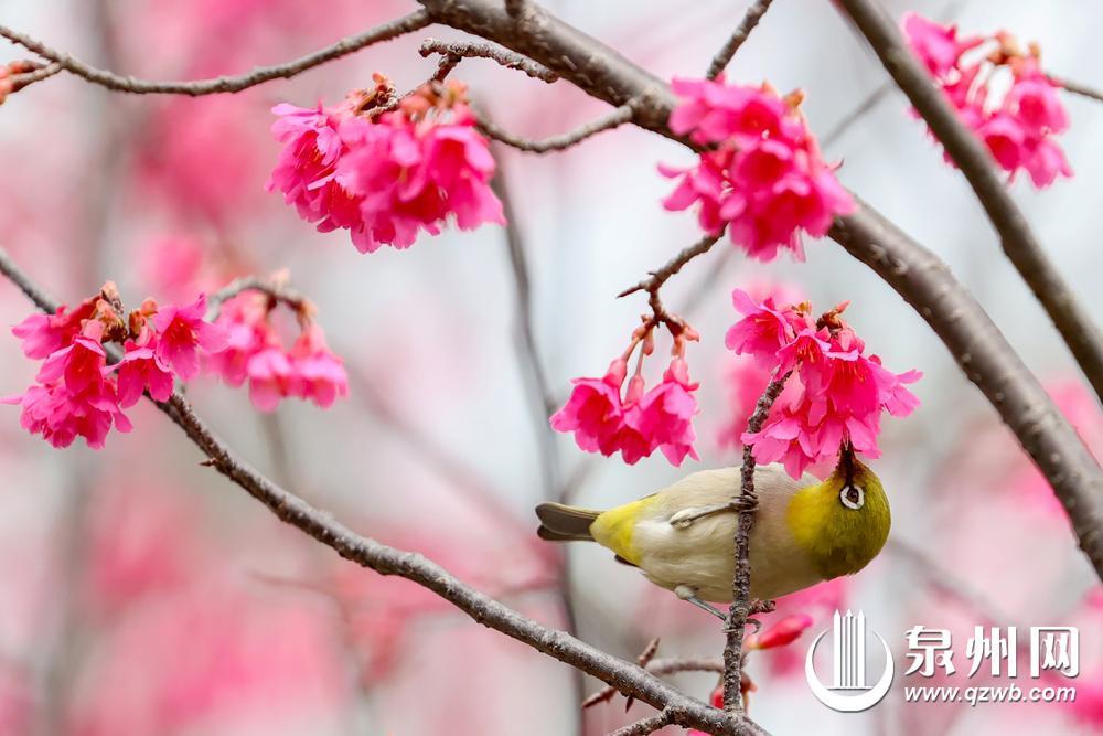眼下,泉州开元寺樱花进入盛放期。千年古刹内,粉色花朵缀满枝头,带来浓浓暖意。绣眼鸟和叉尾太阳鸟在花枝间穿梭觅食,灵动的身影与鲜艳的花朵相映成趣。游客纷至沓来,感受春意与禅意的交融。(融媒体记者陈起拓 摄)