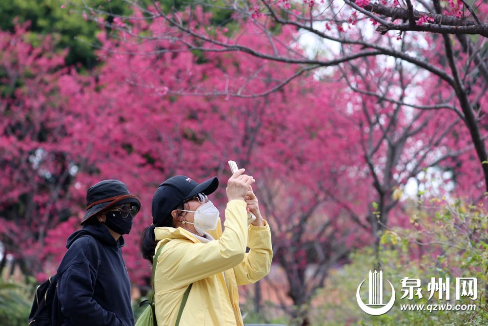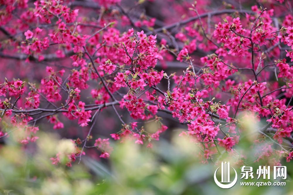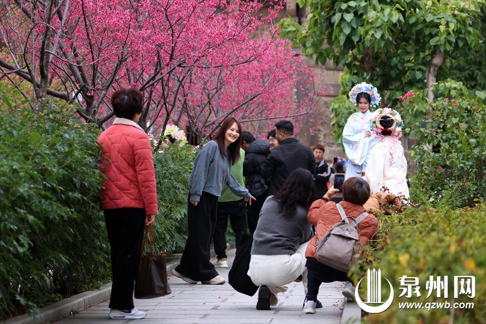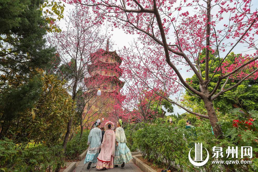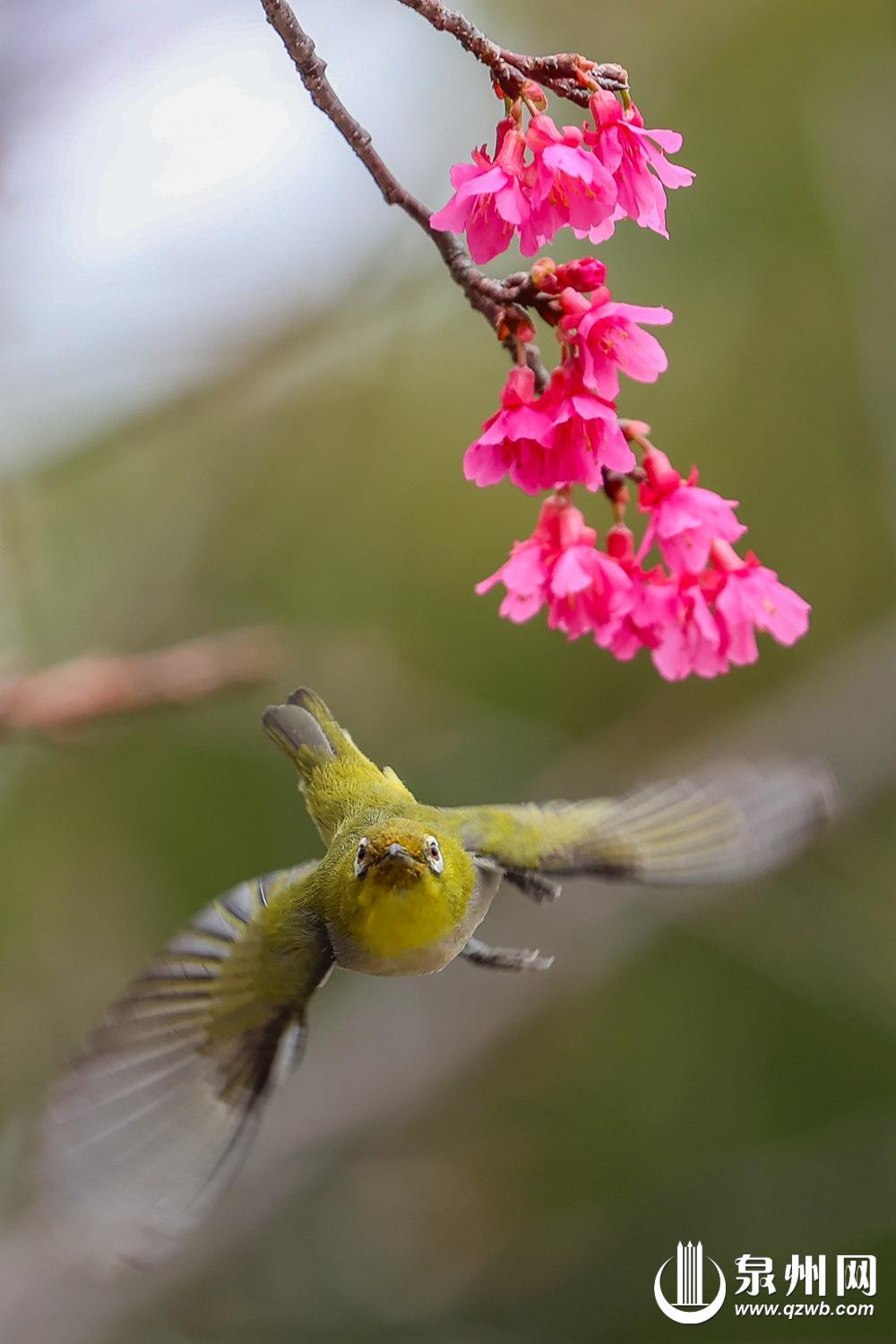 眼下,泉州开元寺樱花进入盛放期。千年古刹内,粉色花朵缀满枝头,带来浓浓暖意。绣眼鸟和叉尾太阳鸟在花枝间穿梭觅食,灵动的身影与鲜艳的花朵相映成趣。游客纷至沓来,感受春意与禅意的交融。(融媒体记者陈起拓 摄)
