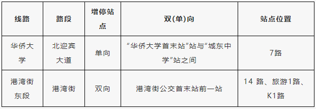 (三)K901路(福厦铁路泉州站-石狮服装城客运站)在和平路取消停靠“青华环岛”站、“赤西路口”站、“和平国际广场”站;在北清西路取消停靠“丰泽实小潘山校区”站。