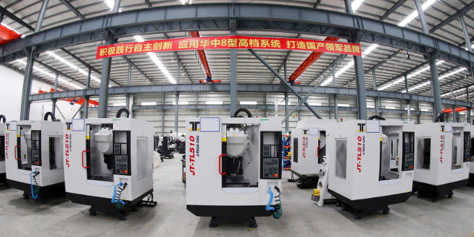 嘉泰数控车间内,批量生产的智能化数控机床整齐排列,颇为壮观。(陈起拓 摄)
