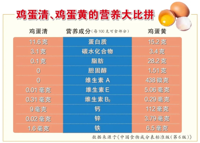 鸡蛋中的蛋白质虽平均分布在蛋清、蛋黄中,胆碱、维生素、叶黄素、卵磷脂等营养物质基本全都在蛋黄里,丢掉蛋黄等于丢掉大部分营养。
