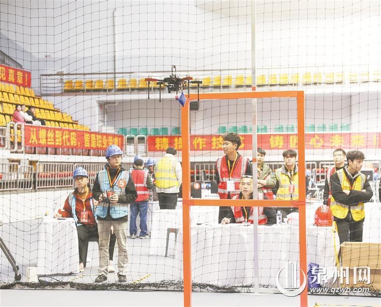 在侨乡体育馆内,2025年泉州市无人机操作与维护职业技能竞赛率先开展,参赛选手手持无人机遥控器,正在进行紧张有序的比拼。