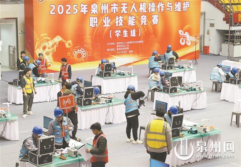 起飞、旋转、降落……在无人机操作与维护职业技能竞赛中,一架架无人机在侨乡体育馆轮番“炫技”,来自全市15所大中专院校的29支“飞手”队伍上演了一场“空中竞技”。泉州技师学院副院长吴聪毅介绍,此次竞赛模拟的是灾后救援的应用场景,考验“飞手”对摄像头、机械手臂等设备的安装调试和图传信号控制,同时还模拟操作灾情现场的搜索、救援、物资投递等场景,相当考验“飞手”的飞行能力和视距内外操作能力。