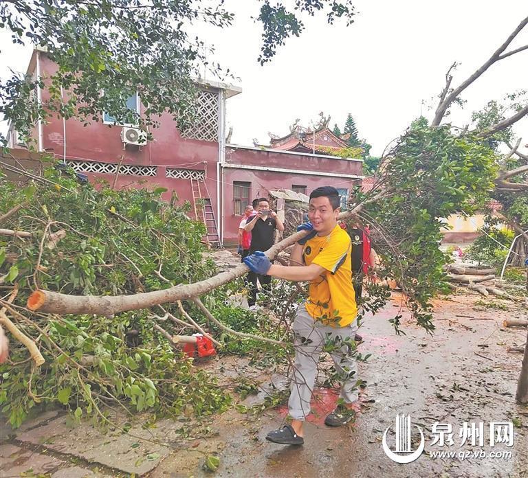 台风“杜苏芮”过境后,泉州的外卖小哥自发参与倒伏树木清理。(惠安融媒中心 供图)