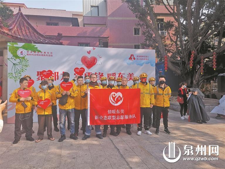 丰泽区丰泽街道东美社区是此次入选的融合试点社区之一。在2025年丰泽区“3·5”学雷锋纪念日主题志愿服务活动中,现场为4支新就业群体(外卖骑手、快递员、网约车司机、主播等)志愿服务团队授旗,并举行了东美社区小区物业“友好使者”聘任仪式。滴滴、顺丰、美团志愿服务队获颁车贴。志愿服务队里的外卖小哥,有人叫他们“流动的网格员”,也有人称他们为基层的“友好使者”,他们是城市中的流动志愿服务力量,在各自的服务半径中延展社会责任。在送餐的路上,发现社区里未及时清理的垃圾、老旧小区脱落的外墙、道路上的安全隐患等问题时,他们会及时上报;遇到走失的孩子、摔倒的老人、走丢的宠物时,他们也会伸出援手。