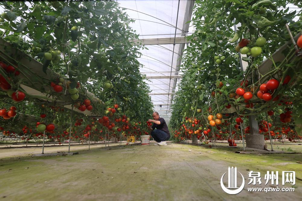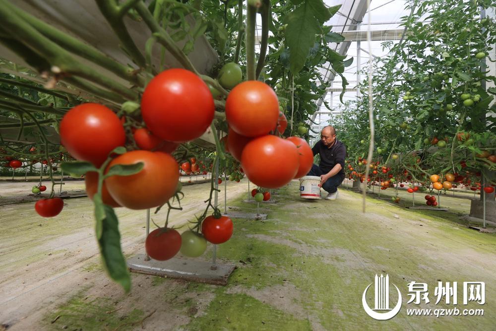 日前,在位于永春县的泉州某生态农业科技有限公司大棚里,一个个色泽艳丽的大红番茄缀满植株。该公司负责人陈其森介绍,该番茄为新引进的以色列无限生长型大红番茄,单果重130~160克,可串收,口感好,经试种后,目前已开始规模化种植。 (融媒体记者 颜雅婷 陈小阳 摄)