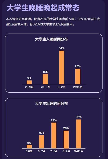 本次调查研究还显示,仅有21%的大学生零点前入睡,25%的大学生凌晨2点后才入睡,有32%的大学生早上9点后醒来。