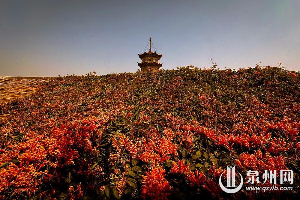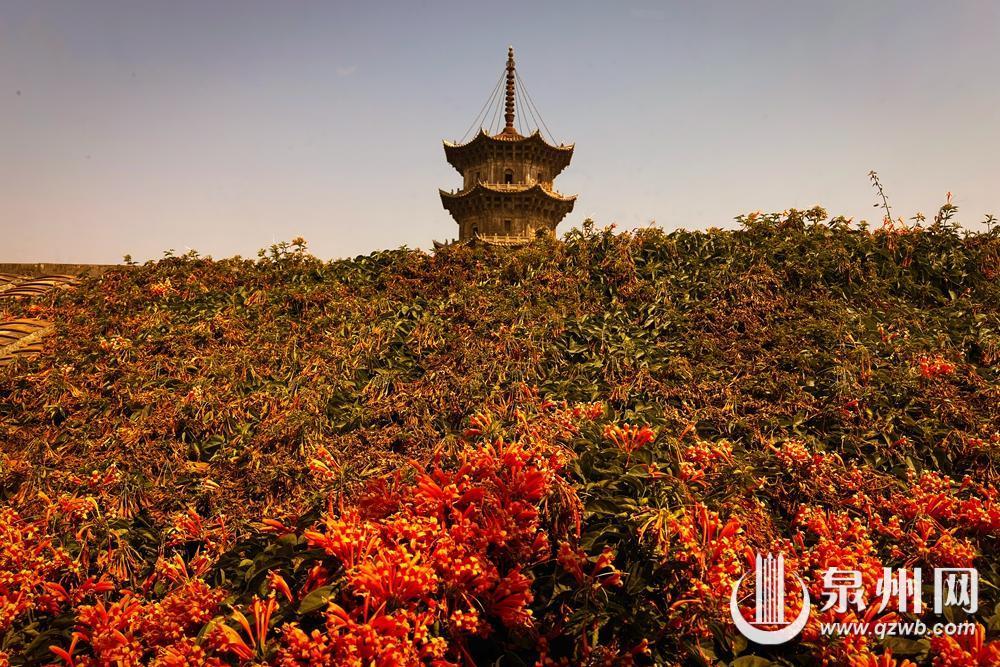 炮仗花的花期为3月至4月初,连日来,市区炮仗花迎来观赏期,橙红色如鞭炮一样的花朵绽放在甲第门、井亭巷及古榕巷等街巷,为“半城烟火半城仙”的古城增添绚烂春意,吸引不少市民游客驻足打卡,记录这份“橙”意满满的春日浪漫。图为井亭巷民居屋顶盛开的炮仗花与开元寺的镇国塔相映成趣。
