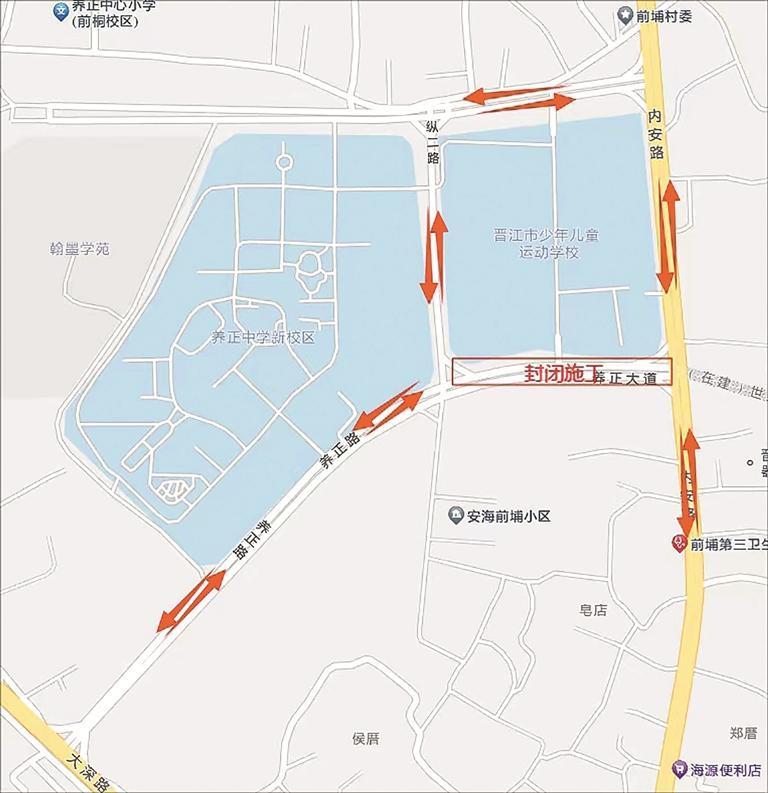 即日起至4月1日,养正大道内垵路至前埔路段右幅主车道、辅道及人行道实行全封闭施工。内安路至养正中学,学生上下学请在前埔村村委会路口处往前埔路行驶绕纵二路直至养正中学。交警部门提醒广大师生、家长,上下学期间,建议由前埔村村委会路口沿前埔路绕行纵二路抵达校区,避开施工封闭区域。该路段已增设临时指示标志,引导车辆有序绕行。