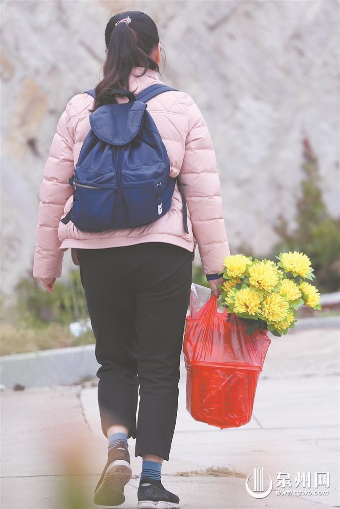 在宏福园墓区,一对夫妇正用小扫帚打扫墓地上的灰尘。27岁的许女士来自丰泽区,每年她都会来祭拜父亲,今年她的丈夫陪同一起前来。擦净墓碑后,二人用鲜花、彩带“绿色祭扫”。“陵园大都位于山上,周围有很多草木,燃烧金纸、放鞭炮容易起火。表达哀思的方式有很多,用鲜花和彩带祭扫效果是一样的。”