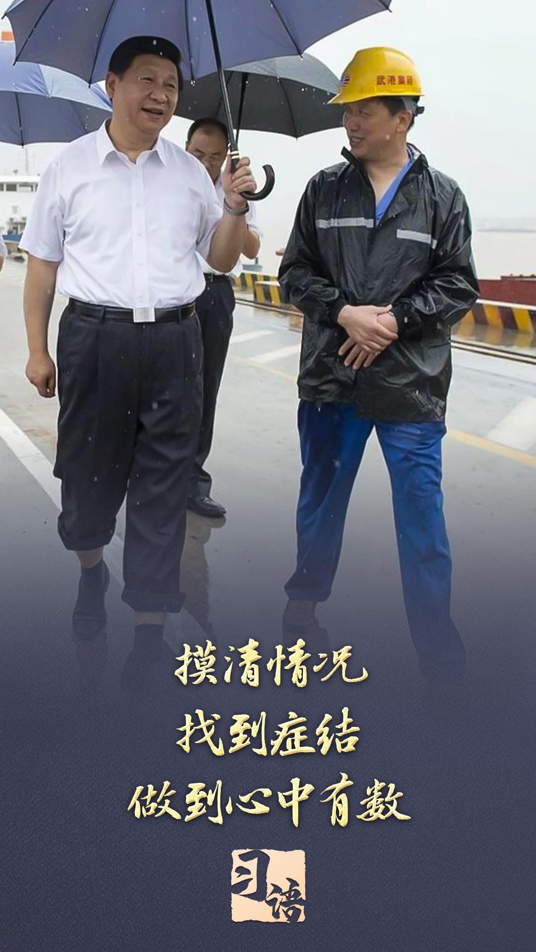 2013年7月,习近平总书记冒雨来到湖北武汉新港阳逻集装箱港区考察,他卷起裤腿,打着雨伞,蹚着积水边走边看边问。两天后,在武汉主持召开部分省市负责人座谈会时,习近平总书记强调:“研究、思考、确定全面深化改革的思路和重大举措,刻舟求剑不行,闭门造车不行,异想天开更不行,必须进行全面深入的调查研究。”