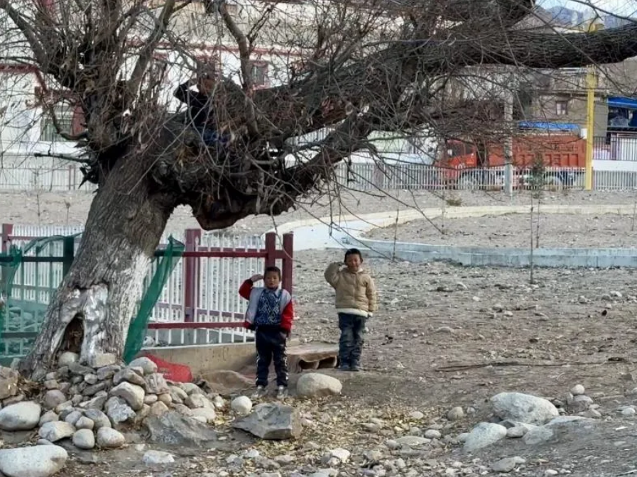 采访结束那天,我们的车缓缓驶离边坝县烈士陵园。突然,两个本在树下玩耍的六七岁藏族孩子,冲出来朝我们立正敬礼。我有些惊讶,迅速拿出手机拍下了这个画面。回去翻看才发现:原来树杈上还有一个孩子,他来不及跳下,就待在树上敬礼,右手绷得笔直。