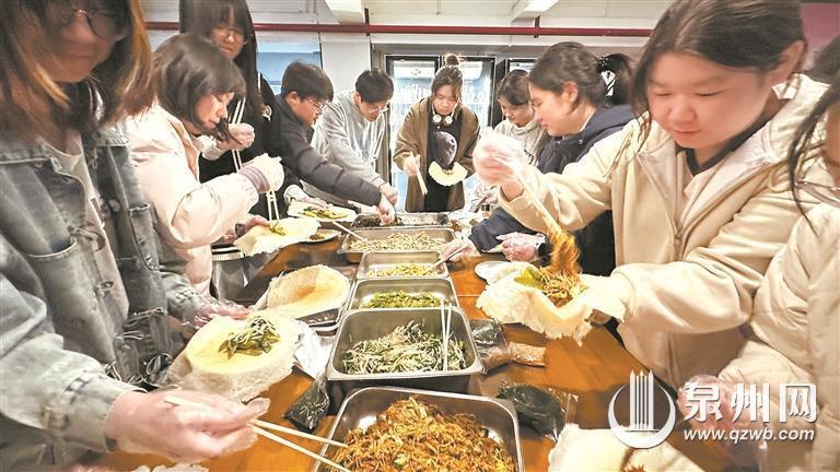 作为泉州清明节特有的美食,润饼菜承载了泉州人民对美食的热爱与追求,包润饼菜的“包”正是泉州城市在美食包容性的生动体现。活动还专门为学生们提供了亲手体验包润饼菜的机会。“挺好玩的,今天的润饼菜食材很丰富,自己动手的感觉真好。”“从北方到泉州读书,我一来就爱上了泉州的美食,特别是润饼菜、姜母鸭都很好吃。”学生们依次参与润饼制作,在亲手包裹馅料的过程中感受传统美食魅力,并相互分享体验后的惊喜与感悟。