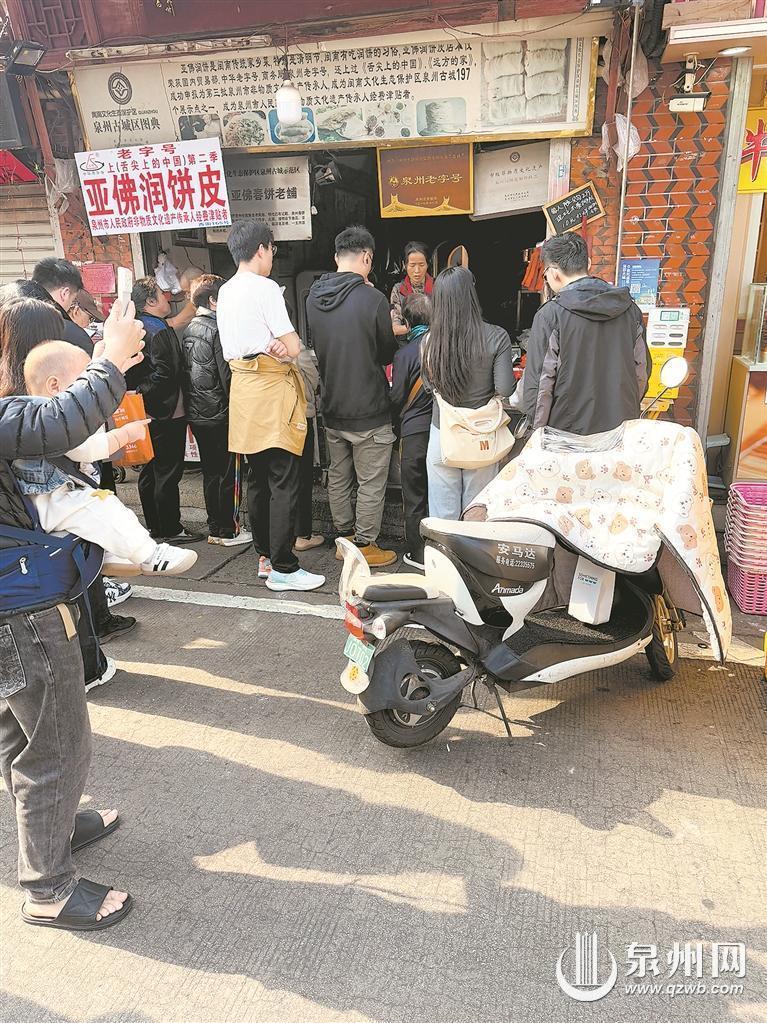 制作润饼皮的摊位前排起了长龙。只见制作润饼皮的师傅将面粉与适量清水、盐混合,揉成面团,接着把分成小块的面团熟练地擀成薄饼,在饼铛上加热,一张张新鲜出炉的润饼皮便呈现在众人眼前。“这就是小时候的味道,每年清明都得吃润饼菜,这样才有过节的感觉。”一位排队的老人说道,脸上满是对往昔岁月的回忆。