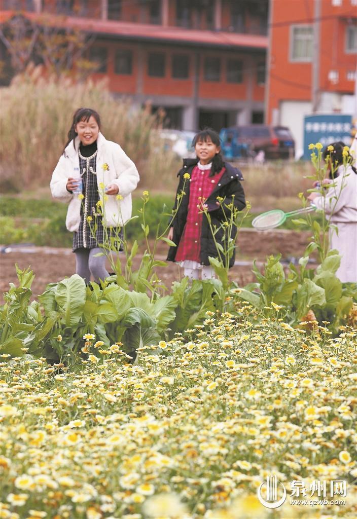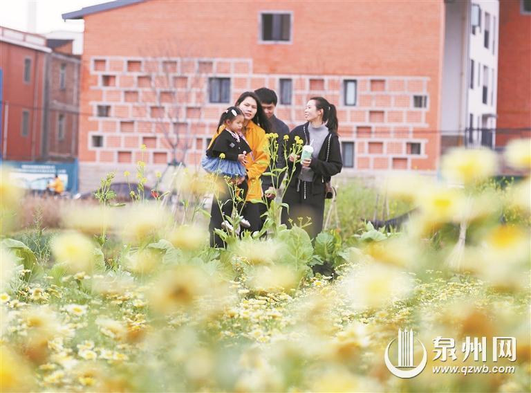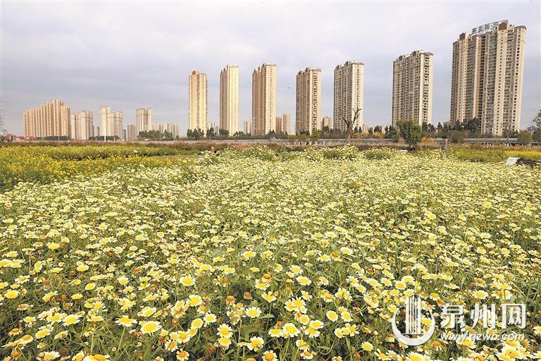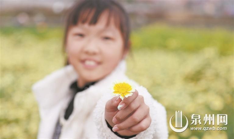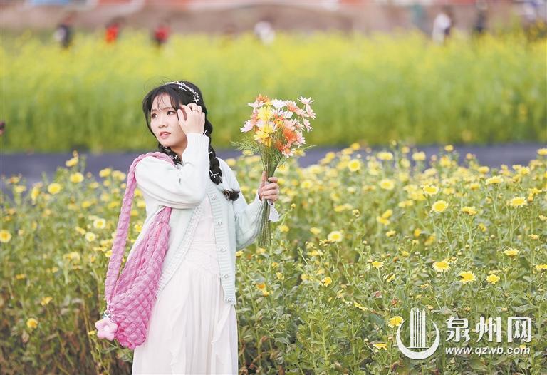 最是一年春好处。近日,春日的晋江九十九溪畔,成片的茼蒿花竞相盛放,金黄色与嫩白交织的花瓣随风摇曳,如繁星洒落大地,吸引了众多市民和摄影爱好者前来打卡。