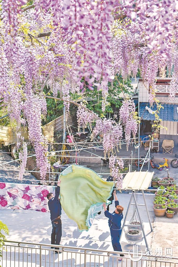 本报讯 (融媒体记者陈明华 苏凯芳 通讯员许华森 文/图)近日,德化县龙浔镇寨头新村村民林宝锻家中,6株紫藤花迎来盛花期,一串串紫色花穗垂挂枝头,将房屋装扮成了“空中花房”,成为众多游客心驰神往的打卡胜地。