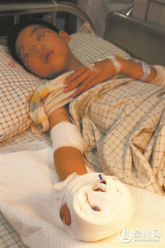 “爷爷,疼。”昨日下午4时30分左右,泉州仁福骨外科医院的病房内,9岁的少杰因术后伤口疼痛而不停地啜泣。爷爷刘聪明在一旁心疼地擦拭着孙子的泪水,自责地说:“如果孩子没帮我绞菜就好了。”