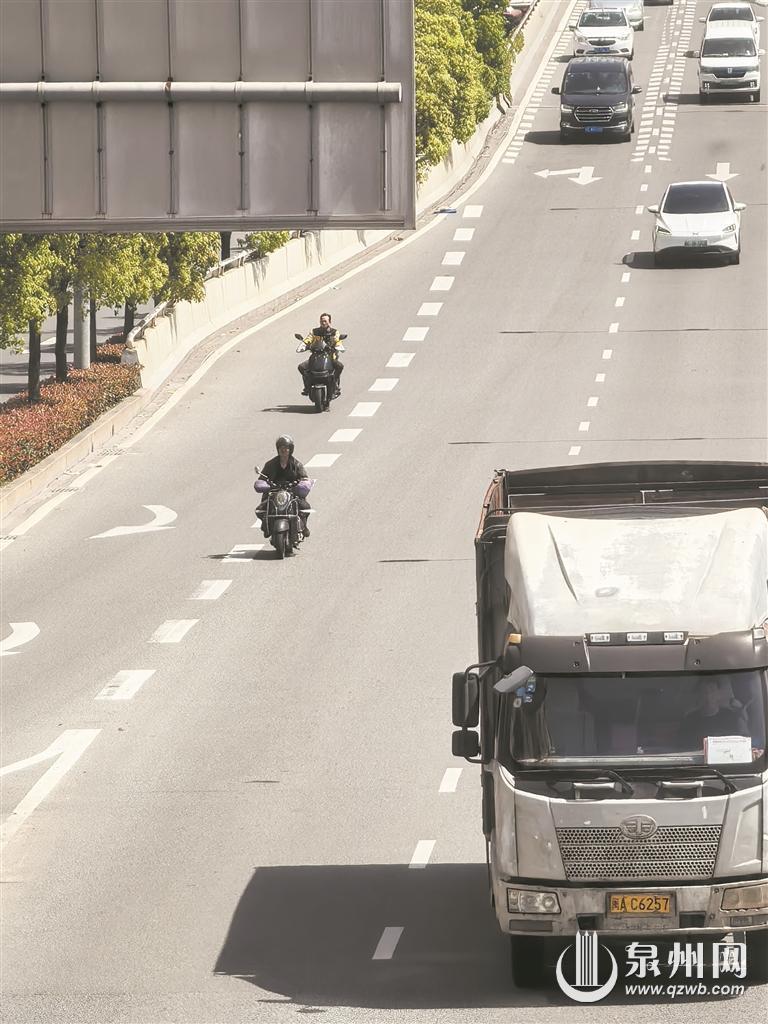 快速通道、高架桥上车速快、车流量大,可部分电动自行车驾驶员因贪图便利,与机动车抢行,极易引发交通事故。近日,在泉州市区坪山高架桥发生了一起大货车与电动车相撞的交通事故。连日来,为进一步消除交通安全隐患,丰泽交警部署开展专项整治行动,严查电动自行车违规驶入快速通道的违法行为。□融媒体记者 张晓明 文/图