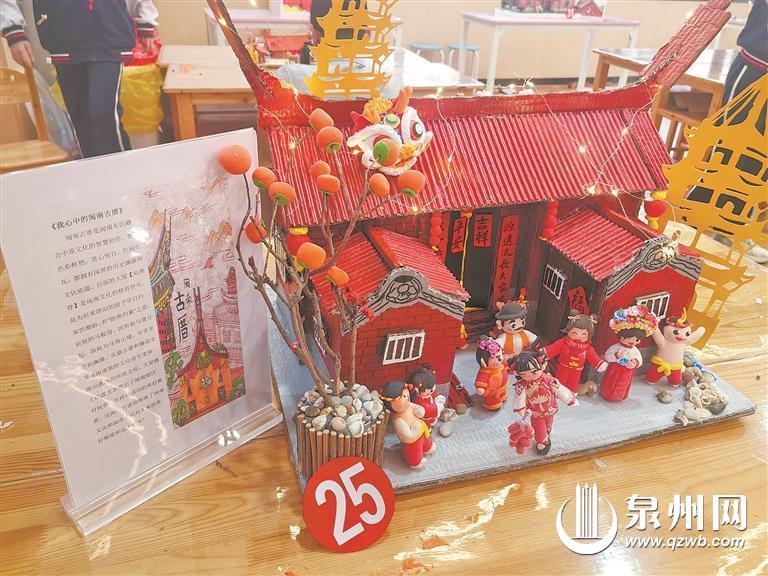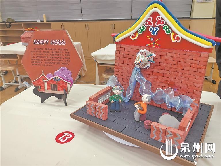 泉州市第二中心小学的同学们则用彩泥复刻了精美的山墙,用微缩的红砖文创材料搭建古厝墙面,以两位老人沉浸于袅袅南音的情境,展现最闽南的生活场景。