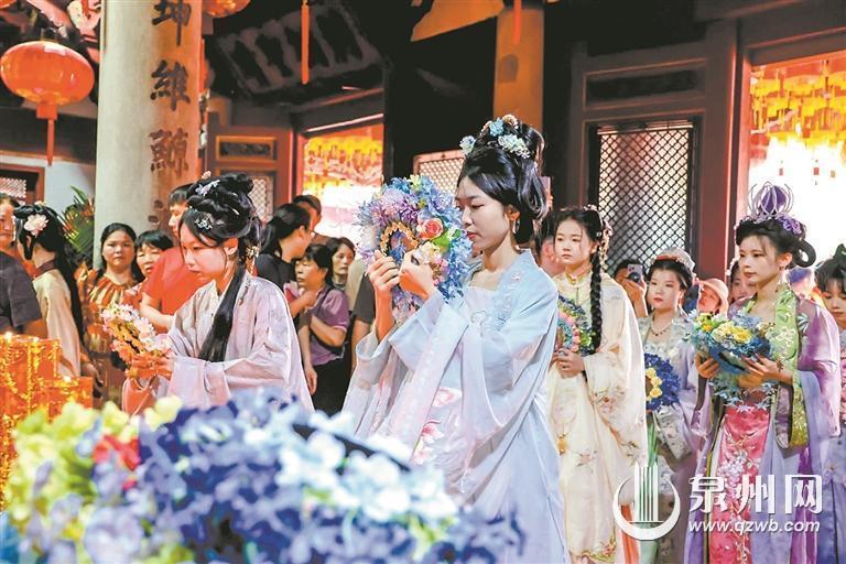 热闹的开场后,身着传统服饰的“十二花使”缓缓步入拜庭,她们手捧象征各个月令的鲜花,梅花、杏花、桃花、牡丹花、石榴花、荷花、玉簪花、桂花、菊花、芙蓉花、山茶花和水仙花,12种月令花含义不同,代表着不同的祝福。68名手持簪花围的“花仙”紧随其后,献花队伍缓缓走进主殿,依次向妈祖敬献。