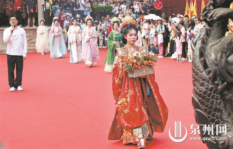 9时30分,庄严隆重的祭典仪式正式开始。奠帛、读祝文、行礼……天后宫拜庭内,乐曲声中,祭典队伍依照古礼虔诚进谒,再现古代官方在泉州天后宫祭祀妈祖的盛大场面。此次,泉州天后宫还制作了原创歌曲《簪花献妈祖》,献礼妈祖诞辰。歌曲曲风以民谣为主,使用木吉他、钢片琴、洞箫、扬琴、笛子、三弦等乐器编曲,旋律轻快悠扬。“不论是歌曲制作还是演唱,都没有使用华丽的技巧,想要通过简单的旋律和真挚的演唱,表达对妈祖的敬仰与祝福。”曲作者及演唱者之一、中国闽台缘博物馆副研究员庄松炜说,能参与这样一首有意义、有深度歌曲的制作,他觉得十分荣幸。