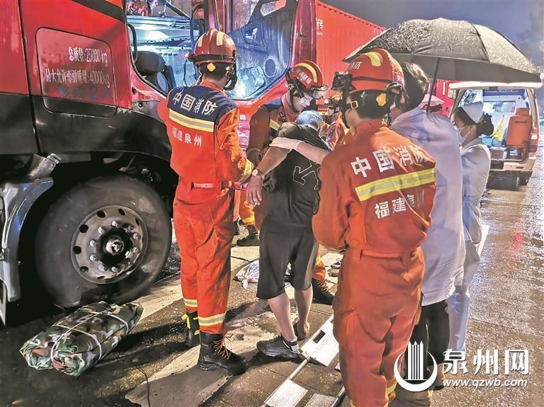 泉州网4月25日讯(融媒体记者傅恒 通讯员杨福 郭云霞 文/图)在路口停车礼让学生过马路时,大货车被后方的半挂车追尾了……4月23日21时20分许,泉港区涂岭镇通港路发生了这样一起交通事故,泉港区消防救援大队南埔救援站消防员迅速赶赴现场处置,将被困的半挂车司机救出。