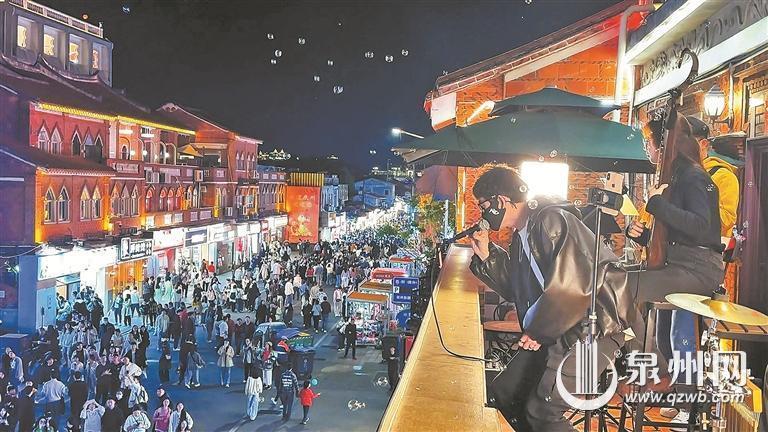 “居然有演唱会的氛围”“下雨天也浇不灭现场的热情”“隔着屏幕被感动到了,必须去泉州打卡”……近来,晚上到西街看一场“天台音乐会”已成为潮流玩法。在现场,当天台音乐响起,路人游客从最初的驻足聆听,到纷纷掏出手机记录,再到全场默契地打开手机闪光灯、随节奏轻轻晃动,点点星光与夜色交相辉映。“一起来!”在乐队的热情号召下,全场大合唱的声浪冲破夜空,让这座千年古城化作露天Livehouse(音乐展演空间)。值得一提的是,这场音乐盛宴无需门票,每周三、周六19点会准时开唱,市民游客可置身旋律与灯火中,感受古城夜晚的热烈与浪漫。