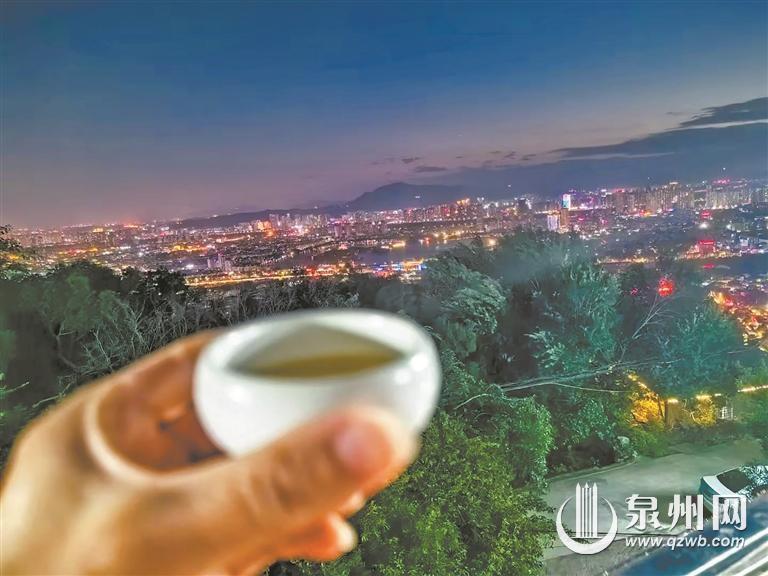 不只夜市,本地“老饕”还有自己私藏的“深夜茶席”。对他们而言,美食意犹未尽,还得再喝上几杯热茶才算圆满。除了白日里的咖啡与蛋糕下午茶,泉州人还偏爱就着醋肉茶点的“闽南夜色功夫茶”。抖音博主“鸡腿儿是我的”在平台上分享道:晚上八点半,和好友驱车抵达清源山南台岩广场,先备一盘新鲜水果,再挑上醋肉、紫菜酥等馋人的炸物,顺带热气腾腾的小点心、爽口烫青菜,提上红色暖壶、架起煮水小炉,端起茶杯,俯瞰南台岩下泉州城的万家灯火,美食与茶香交织,将仪式感直接拉满。他称这是“清源山喝夜茶的正确打开方式”。有的网友则表示,带着露营装备、泡茶工具和果盘小食上山,自择一处饮茶赏景同样惬意。在泉州西湖公园,记者也撞见了这份喝夜茶的“松弛感”:临湖的茶桌旁,有人独坐饮茶,从夕阳染红湖面到夜幕低垂;有人三五围坐,鸡爪佐茶,闲聊家常,在袅袅茶烟里消解一日疲惫。泉州的夜,从舌尖到心间,蕴藏着抚慰人心的治愈力量,是夜游时邂逅烟火与诗意的温柔归处。