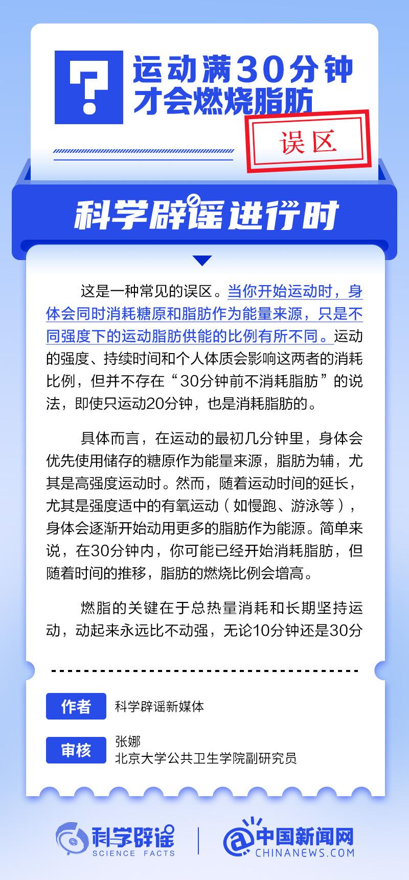 中新网5月16日电 当你开始运动时,身体会同时消耗糖原和脂肪作为能量来源,只是不同强度的运动脂肪供能的比例有所不同。运动的强度、持续时间和个人体质会影响这两者的消耗比例,但并不存在“30分钟前不消耗脂肪”的说法,即使只运动20分钟,也是消耗脂肪的。燃脂的关键在于总热量消耗和长期坚持运动,动起来永远比不动强,无论10分钟还是30分钟,坚持才是关键。(来源:@科学辟谣 中国新闻网微博)