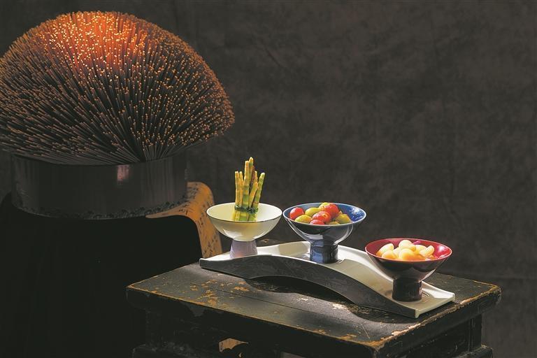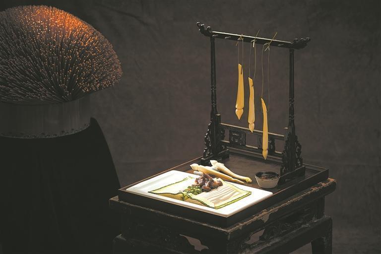菜品“妙笔生花”中的“书页豆腐”选用五里街老豆腐切成薄片,清蒸后宛如展开的书卷,洁白的豆腐上点缀着各色食材,旁边缀以茭白笋做成的“笔”。当银筷夹起“笔”划过“书页”,让人遥想文人挥毫的风雅。