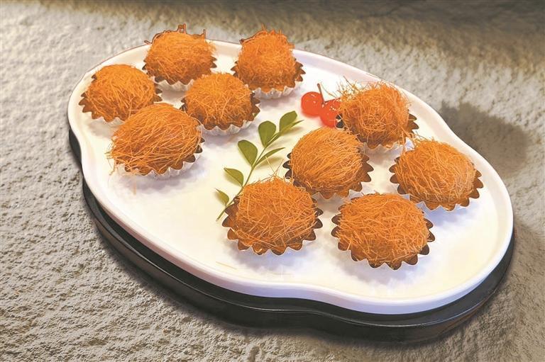 “连中三元”(金丝芋圆酥)是一道地道闽南风味菜肴,以猪肉、笋丁包入芋泥制成丸子,裹上面线入油锅炸至金黄,口感脆爽丰富,色泽金黄贵气,颇有“连中三元”的喜乐之感,也暗合闽南人常说的“食芋好头路”之意。