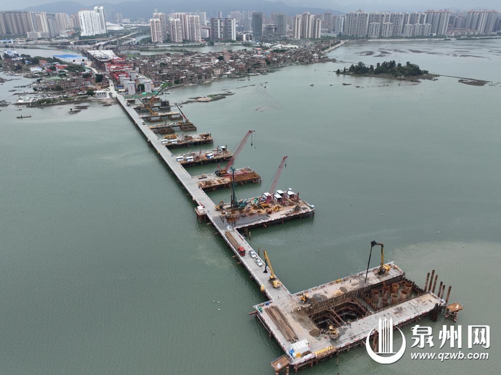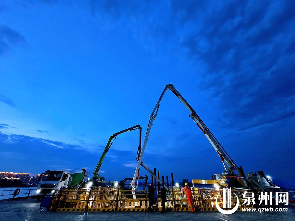 5月22日凌晨4时,泉州金屿大桥施工现场传来捷报——Z2主墩承台顺利完成混凝土浇筑,标志着这座环湾核心区重点工程取得关键性节点突破,为后续工程的推进奠定了坚实基础。图为施工现场。(融媒体记者陈小芬 通讯员林庚钗 谢静怡/摄影报道)