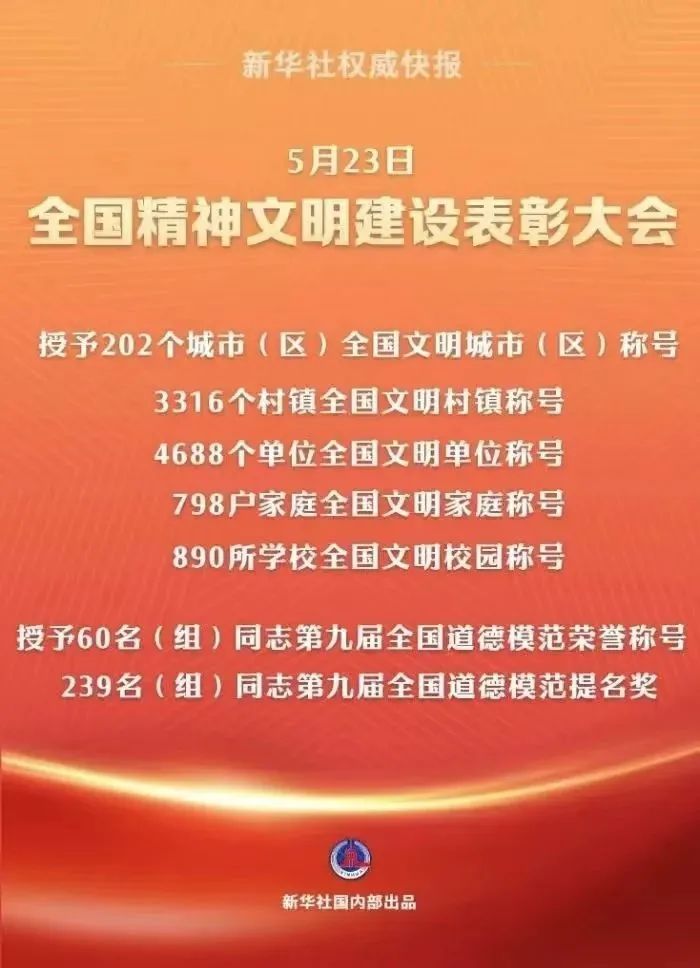 中央宣传思想文化工作领导小组决定,授予202个城市(区)全国文明城市(区)称号,授予3316个村镇全国文明村镇称号,授予4688个单位全国文明单位称号,授予798户家庭全国文明家庭称号,授予890所学校全国文明校园称号;授予60名(组)同志第九届全国道德模范荣誉称号,授予239名(组)同志第九届全国道德模范提名奖。