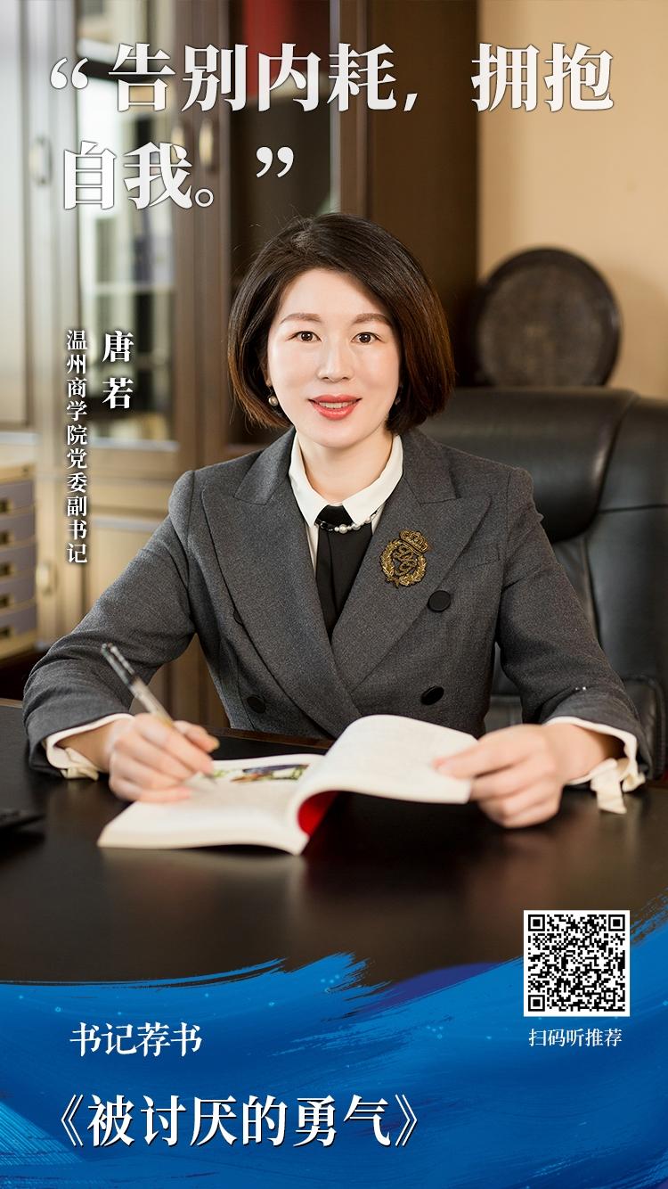 为充分发挥温州高校阅读联盟平台的纽带作用,营造高校师生人人参与、共建共享的良好阅读生态氛围,丰富高校师生精神文化生活,助力 “书香社会、阅读温州” 建设,即日起,温州高校阅读联盟正式启动 “书香青春·领读未来” 主题活动。活动期间,各在温高校书记、校长、图书馆馆长等将通过镜头推荐书籍,分享阅读感悟,启迪师生心智。5月25日,温州商学院党委副书记唐若带来《被讨厌的勇气》,一起学着“吾爱吾”。