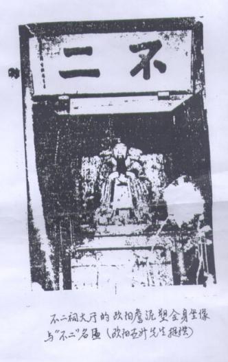 相关史料记载,不二祠中堂供奉欧阳詹像,高丈余,衣冠庄严,堂中有匾额“不二”,为后人特地搜集欧阳詹墨宝“不”“二”二字镌刻制成(现该匾藏于泉州市博物馆)。“不二”强调了欧阳詹一生治学“专心不二”的态度,也表达了“温陵甲第破天荒”的欧阳詹“独一无二”的成就。堂前悬木刊联二:一为朱熹所纂“事业经邦闽海贤才开气运,文章华国温陵甲第破天荒”;一为何乔远所纂“不二题堂银钩铁画论当年合班颜柳欧虞之列,无淫箴室,神窥天鉴待后学只开吴闽濂洛之先”。不二祠在20世纪60年代被毁。