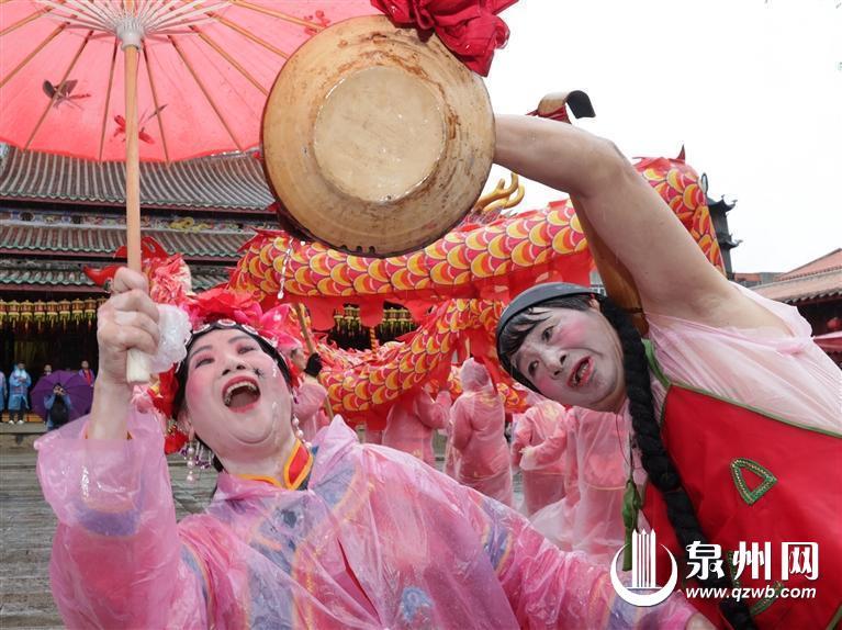 来自浮桥街道仙境社区的吴常莲今年63岁,在巡游队伍中扮演“公背婆”一角。为了这场活动,她早上5点就赶到泉郡后山宫化妆准备。她还背着十几斤重的“公背婆”道具,在雨中巡游近3小时。虽然辛苦,但她脸上始终带着笑容,“泉州游客越来越多,每次参加这种巡游活动都感觉很喜庆,也能展现咱们闽南独特的传统民俗文化,心情很好。”