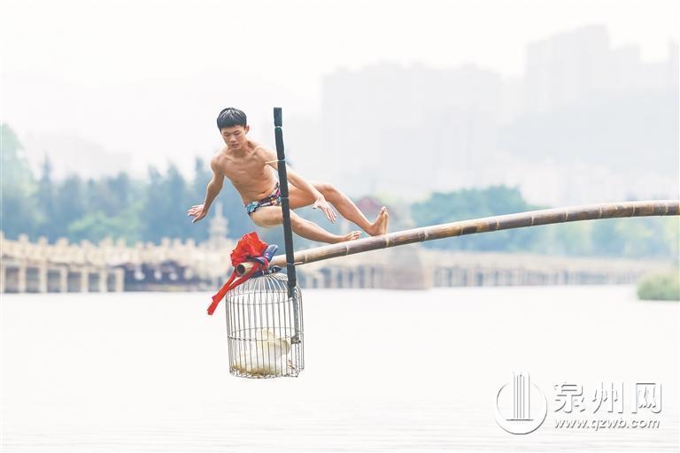 当日14时许,安平桥景区人声鼎沸,热闹非凡。演艺岛装扮成“福船”,碗口粗的竹竿从“船头”伸出水面,竹竿涂抹油脂,末端悬挂着鸭笼,“水上掠鸭”竞技活动正热闹上演,现场惊险刺激又妙趣横生,观众笑声、喝彩声此起彼伏。云南的鲁先生拔得头筹,他稳稳站上竹竿,脚步快速有节,靠近鸭笼时以迅雷不及掩耳之势拍开笼门,成功“探囊取物”。“不紧张,爱拼才会赢,积累经验,下次再来。”江西的吴先生多年没下水,为了体验泉州端午习俗,踊跃来到现场,虽说没有成功“掠鸭”,但觉得能够现场感受非遗文化更好。
