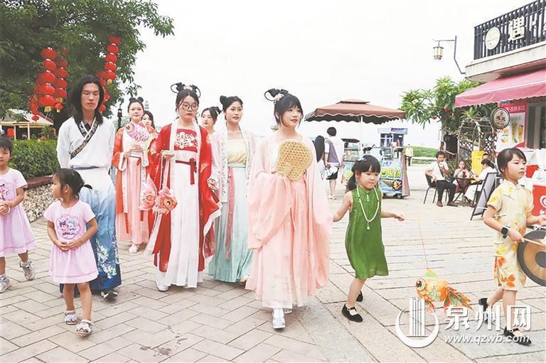 “锵锵……”循声望去,游客跟随汉服巡游队伍往侨批馆走去,馆内布袋木偶戏非遗传承人带来的《武松打虎》吸引了大家打卡拍照,孩子们在互动中完成打卡任务。馆外,游客正忙着体验宋式点茶非遗技艺。不远处,青年艺术家演唱着闽南歌曲,吸引游客驻足停留。
