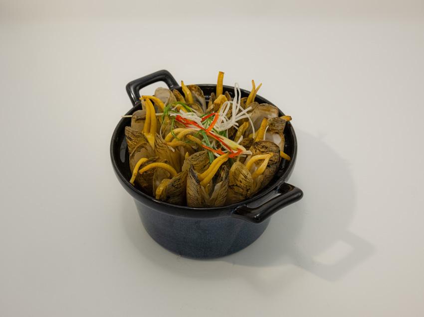 丁瀚斌介绍,当下肥美的海蛏,传统做法多以蒸煮或炒制为主,旨在保留其鲜味。传统老菜中有一道“老豆腐插蛏”,巧妙地利用了蛏钻土的特性。将处理干净的蛏子,蛏头朝下插入豆腐中,再在间隙放上姜片,上锅清蒸。只需加入少许蒜蓉和姜丝调味,清蒸后的豆腐吸收了蛏子的鲜味,变得鲜嫩多汁,蛏子的鲜甜也得到了完美地展现。炒制海蛏则更为快捷,将蛏子处理干净后,加蒜蓉豉油腌制入味,然后下锅猛火爆炒,在保持鲜甜的同时,增添了一份咸香,让人食欲大增。在当地,海蛏三层肉羹汤也是一道特色美味。