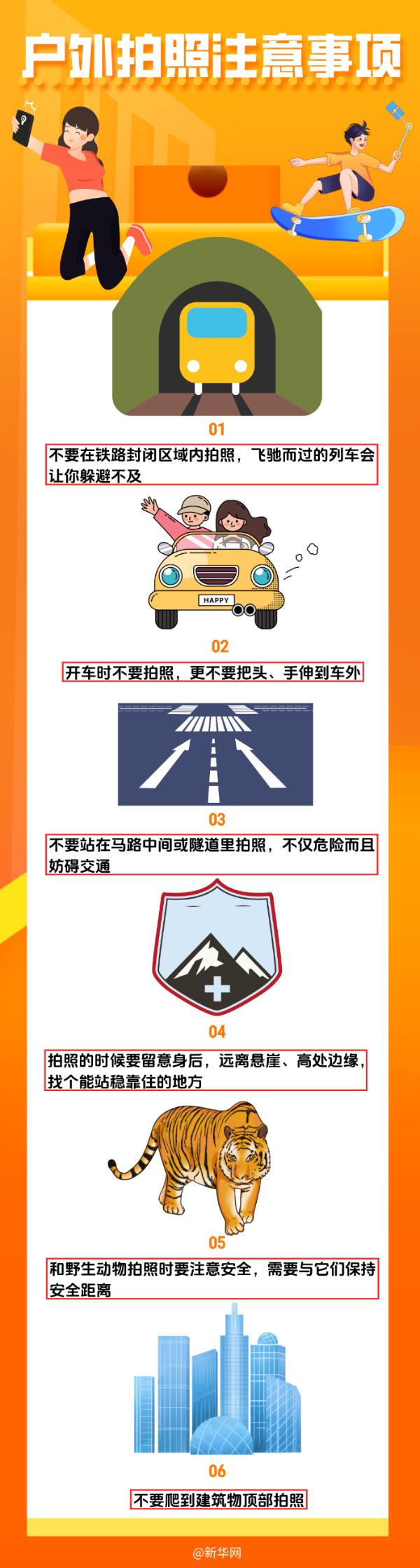 出门游玩拍照时,要留意周边环境,切不要在危险区域拍照,“玩命自拍”更是要不得。