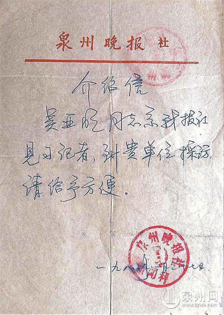 1985年,泉州晚报创刊。报纸发行一年多后,在古城读大学的我和另外四位学友,幸运地得到一次寒假去泉州晚报新闻科当见习记者的机会。那时报社还在庄府巷一栋楼的二层,办公条件极为简陋,整个新闻科挤在一间教室大小的房间里,我们几个连张椅子都没有。晚报领导给我们每人开了张介绍信,我们几个手里紧攥着那张铁画银钩的介绍信,像握着通往新闻圣殿的通行证。