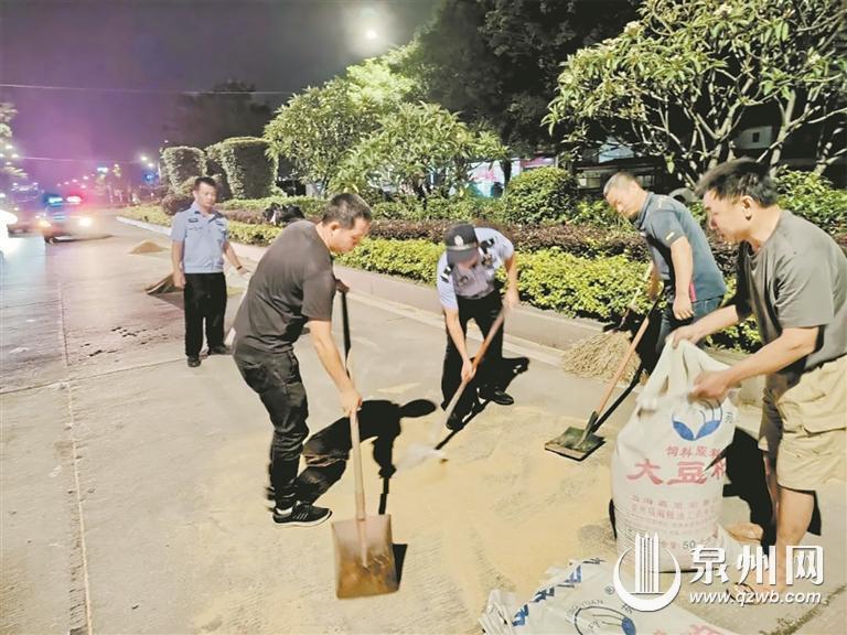 “警察同志,我货车上的饲料全撒路上了,你们能赶紧来帮帮我吗?”不久前的一个夜里,涂岭派出所接到一名货车司机报警求助,称自己因疏忽大意把运送的饲料撒了一地,影响了路面交通。接警后,民警陈渊东迅速带队抵达现场。他一边组织人员疏导交通、维护秩序,一边帮助司机将散落的饲料重新打包装车。经过近1个小时的努力,饲料得以全部回收,道路也恢复了畅通,货车司机握着民警的手连声道谢。