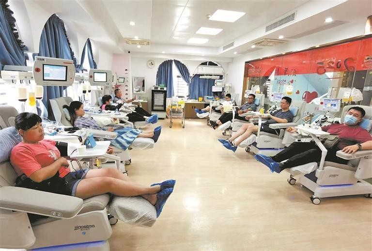 6月14日,市中心血站机采血小板的大厅座无虚席,许多志愿者捐献血小板100次以上,他们默默奉献,让众多伤病员的生命得到挽救。