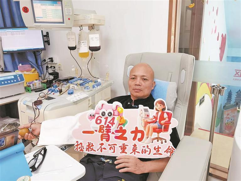 从第一次献血到现在,他从未间断。后来了解到临床治疗需要血小板,他又报名捐献。他说,现在一个月捐献两次、一年24次捐献血小板已成习惯。