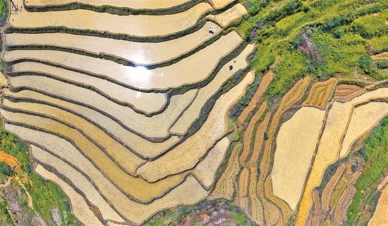 镜头里,依山而筑的梯田如银链般从山脚盘旋而上,灌满水的田畴宛若明镜,将蓝天白云、葱茏青山尽收其中,蜿蜒的田埂勾勒出自然的几何美学。勤劳的农夫踩着晨雾,牵着黄牛,犁开一片片水光潋滟的诗行。