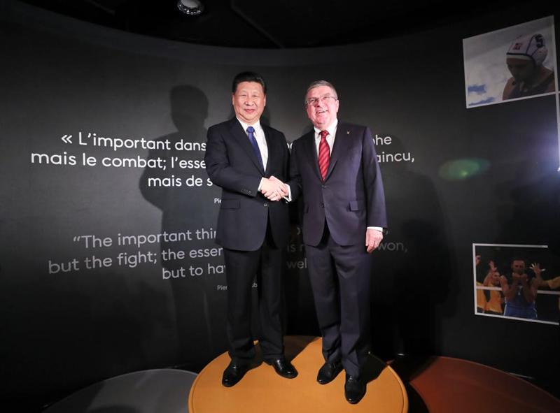 2017年1月18日,习近平主席在位于瑞士洛桑的国际奥林匹克博物馆会见时任国际奥林匹克委员会主席巴赫。