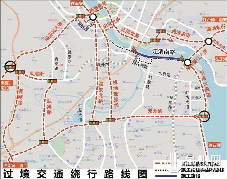 东海、惠安往南安、厦门方向,路线一:泉州晋江大桥—沿海大通道—双龙路;路线二:通港西街—云鹿路—江滨北路—顺济新桥/田安大桥—南迎宾大道。