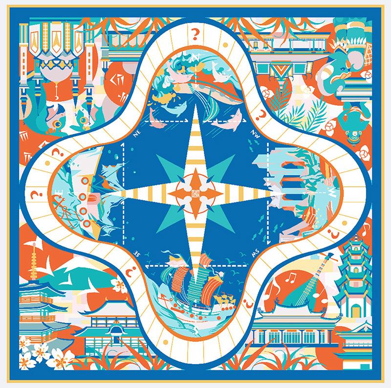 在2022年第五届“润物无声”泉州文创旅游商品设计大赛中,桌游文创《扬帆起航——海上丝绸之路主题飞行棋地毯设计》荣获世遗奖二等奖。该设计以宋代海上丝绸之路为主题,融入宋代中国、日本、大食、吴哥王朝的人文景象与自然元素,通过飞行棋的形式串联航线,以示海上贸易互通往来。飞行棋还与地毯组合,在亲子互动和朋友娱乐中通过任务卡牌扫码阅读的方式,科普海上丝绸之路文化知识,寓教于乐,传播中国传统文化。