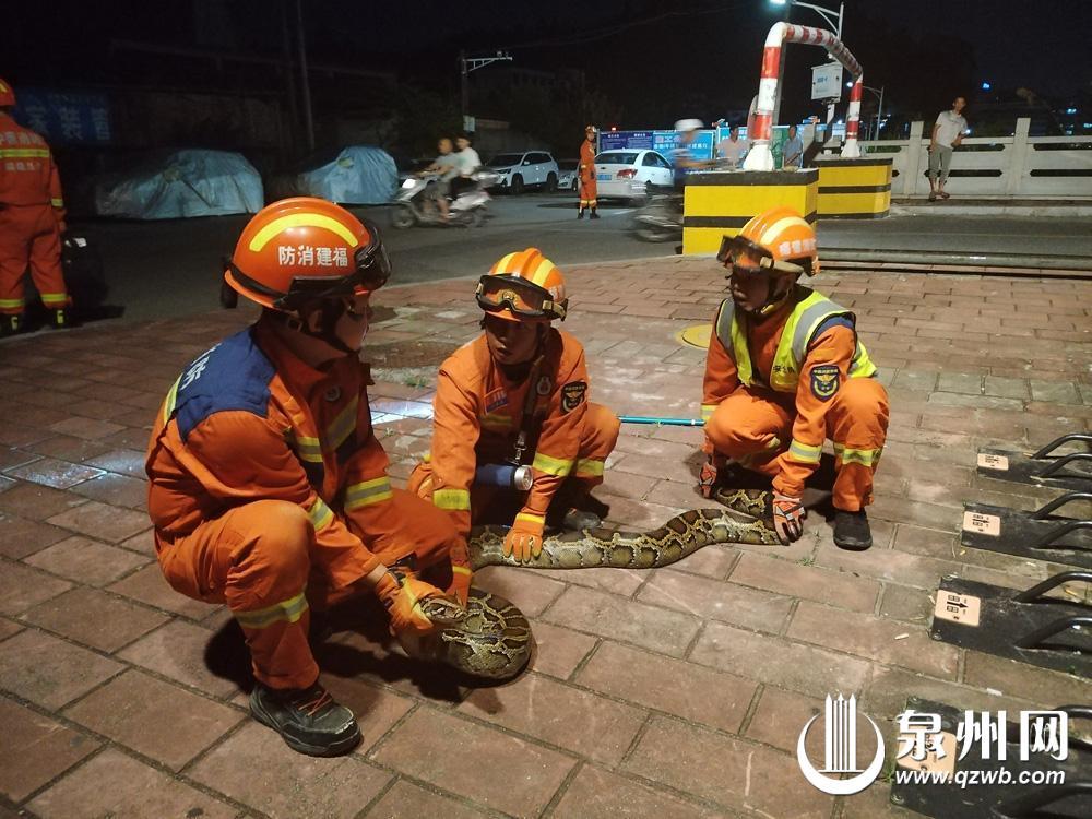 泉州网6月27日讯(融媒体记者傅恒 通讯员刘少宏 黄友漳 文/图) 6月23日晚,德化县浔中镇浔北东路有大蟒蛇出没,体型巨大,德化县消防救援大队三班小型救援站接到报警后,立即前往处置。
