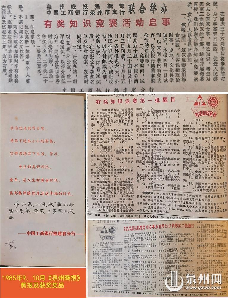 1985年,泉州晚报创刊的第一年,单位图书馆便订阅了这份报纸。那个时候,人们获取时事新闻和知识的渠道较为单一,除了收听广播,便是阅读报刊杂志。我自然成了那里的常客,也是泉州晚报的忠实读者。1985年9月11日泉州晚报刊登了有奖知识竞赛的启事,并于9月24日、10月3日分两次在报上刊载共50道竞赛题目,内容涵盖政治、时事、史地、文学、自然科学等各方面知识,多数内容在试刊以来的报纸内容上都能找到,算是开卷竞赛。我参加了这一赛事,并获得了三等奖,奖品之一是一本我至今仍在使用的相册。